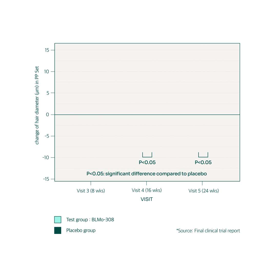By week 16 of our clinical trials, participants saw significant differences in the thickness of their hair. At the end of the 24-week trial, the control group saw a decrease in the diameter of each hair strand, while participants saw a much greater increase. 75% of participants saw a visible difference in the thickness of their hair.