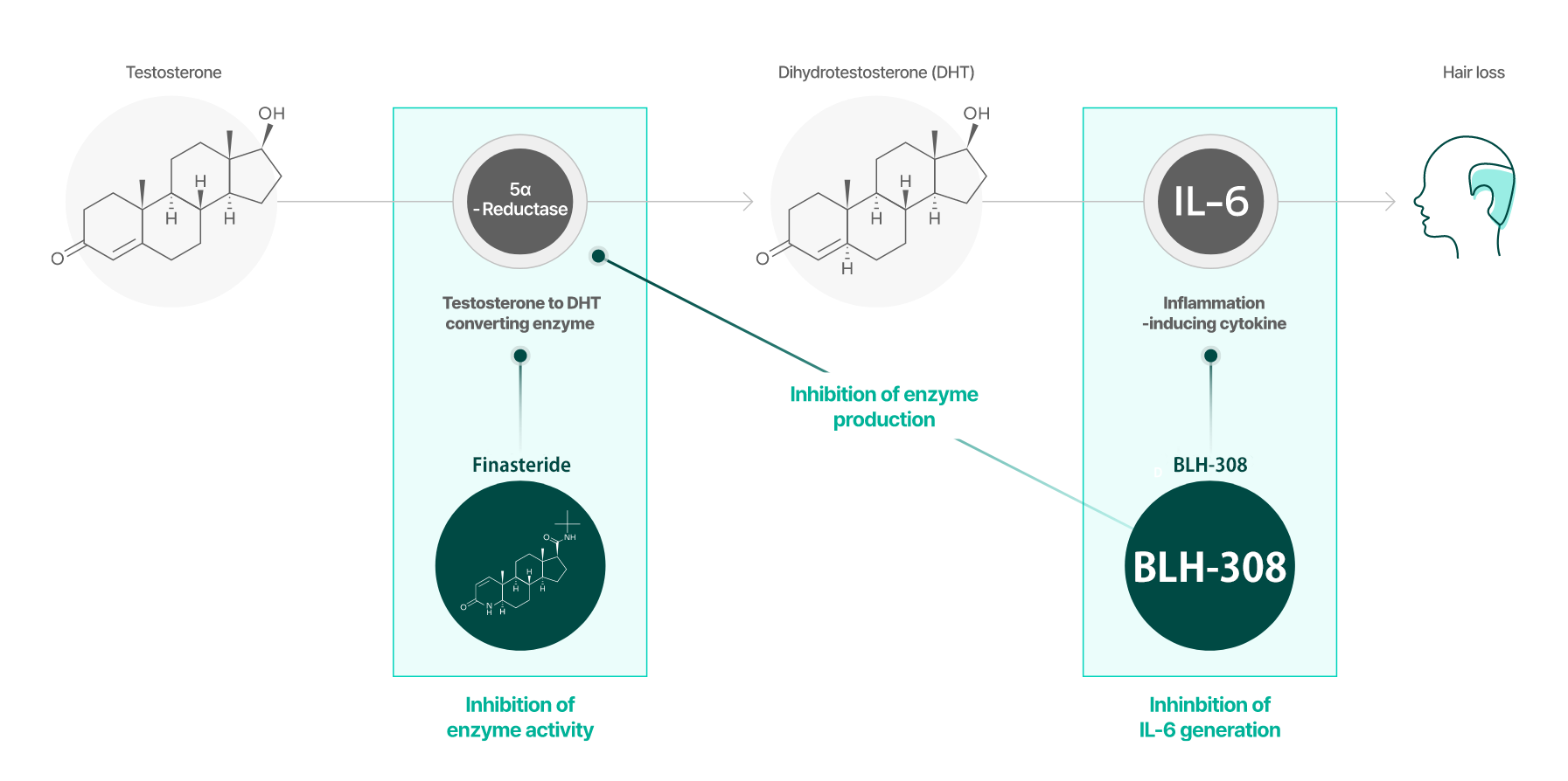BLH-308 is composed of high-quality plant extracts, not chemical compounds. We have revealed that IL-6, an inflammatory cytokine induced by DHT, is ultimately the cause of hair loss. However, finding an ingredient to inhibit it from natural food sources was difficult task. It involved a repetitive process of discovering and testing natural substances with potential efficacy, and the process of finding ingredients alone took more than a decade. In 2015, we finally discovered the effective ingredients. Then, the process of finding the optimal blending ratios of these discovered ingredients was necessary. After countless trials and errors, we ultimately found the blending ratios that would maximise the therapeutic effect.